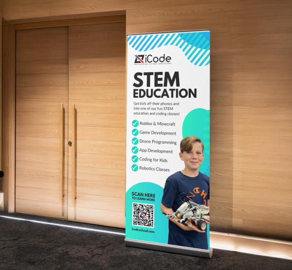 Make a bold statement with the iCode Retractable Banner Stand! Designed for franchisees, this sleek and professional 33” x 80” display is perfect for showcasing your iCode school at events, open houses, and in your learning center.