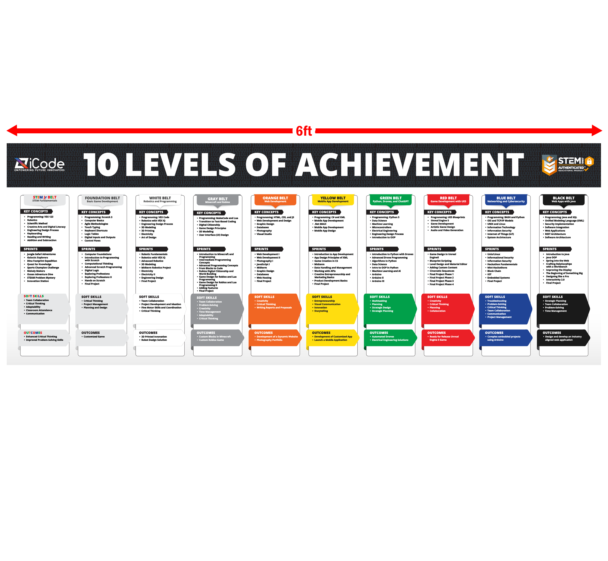 Motivate your students with the iCode Belt Mural! This giant wall graphic visually breaks down all 10 levels of achievement in the iCode Belt Program, helping students track their journey from Foundation or White Belt to Black Belt.